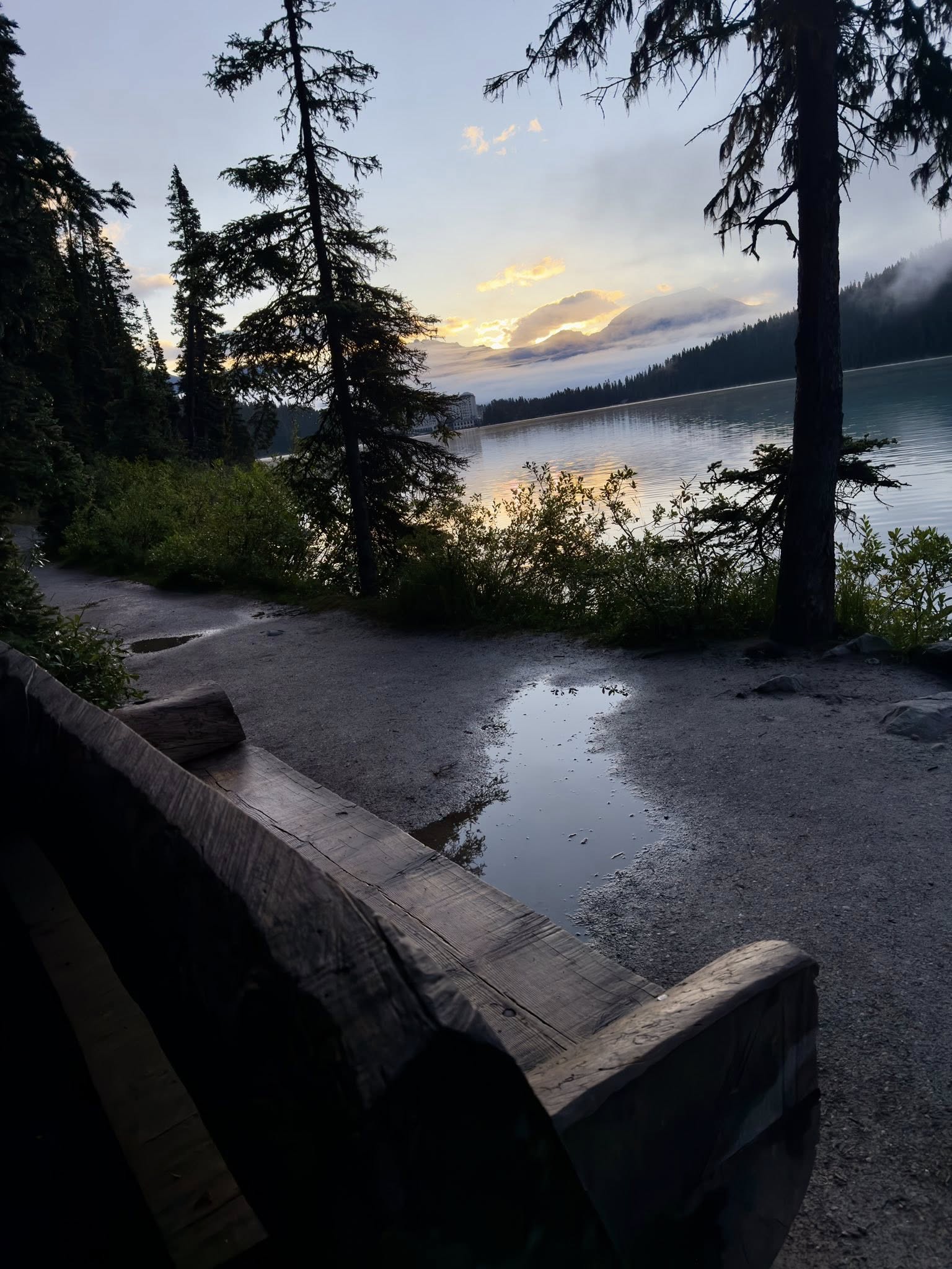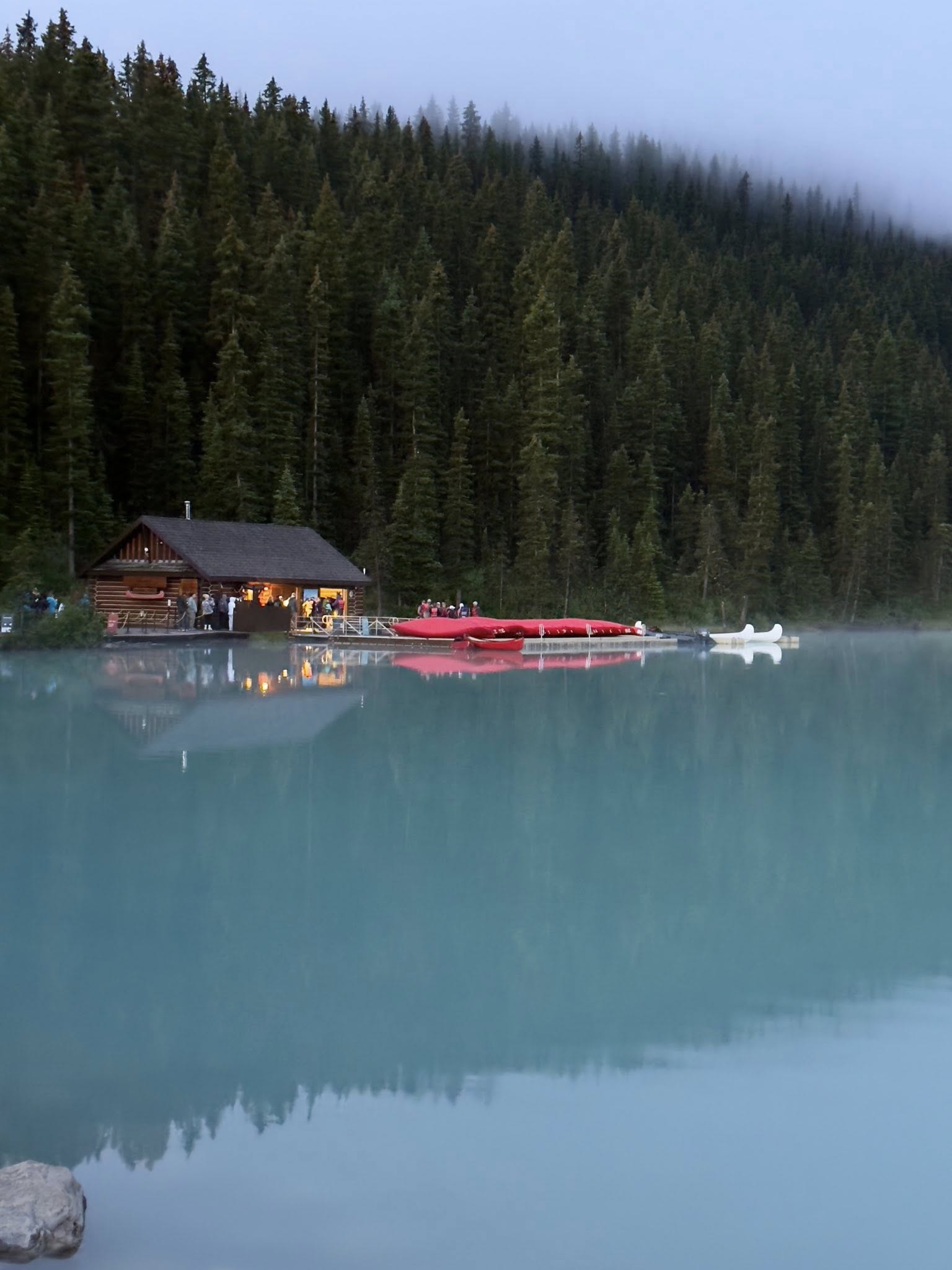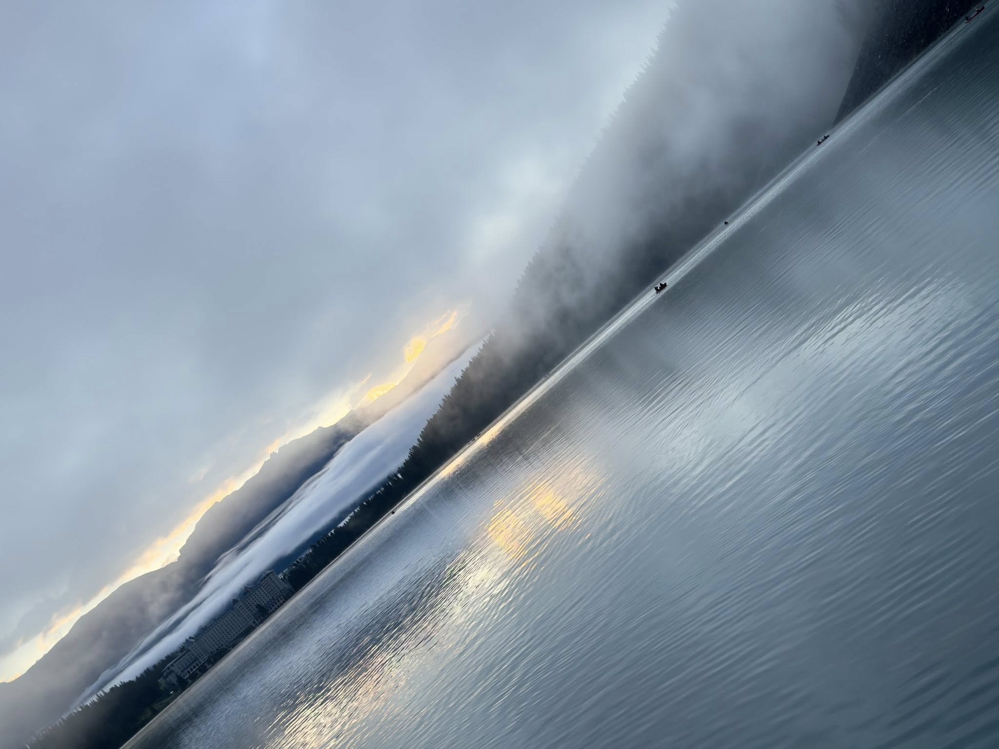 Lake Louise…ore 5:30…2 gradi…nebbia fitta e buio… ma dopo tante albe in solitaria non potevo perdermi questa. Alle 5:45 parcheggio del lago Lake Louise praticamente pieno e tante ma tante persone in attesa dell’alba al bordo della riva. Io mi spingo in camminata invece fino ad arrivare alla base del ghiacciaio e questo mi permette di non incontrare nessuno e soprattutto avere scorci migliori. Peccato per la nebbia ma anche quest’alba ha avuto un bel suo fascino.