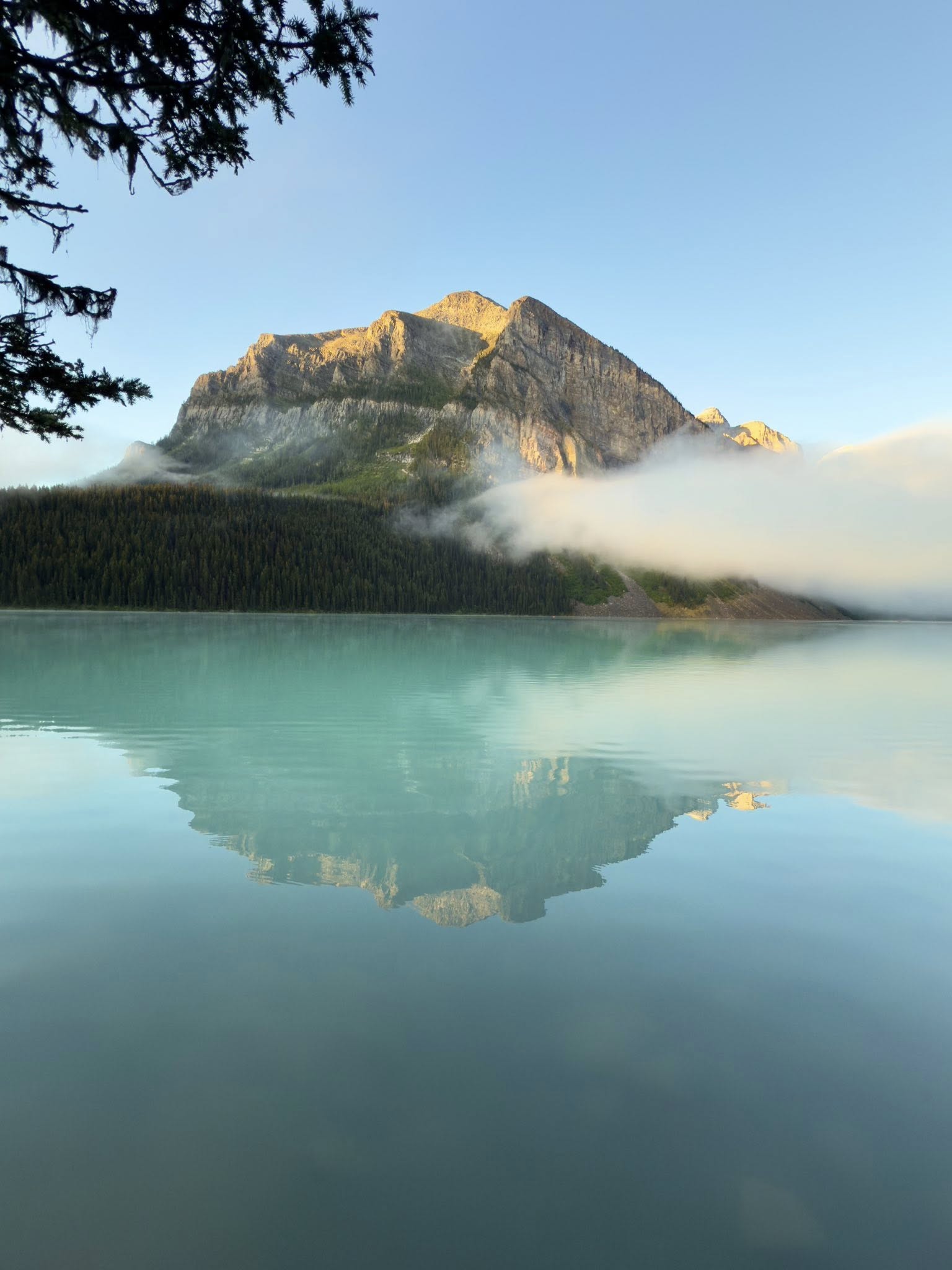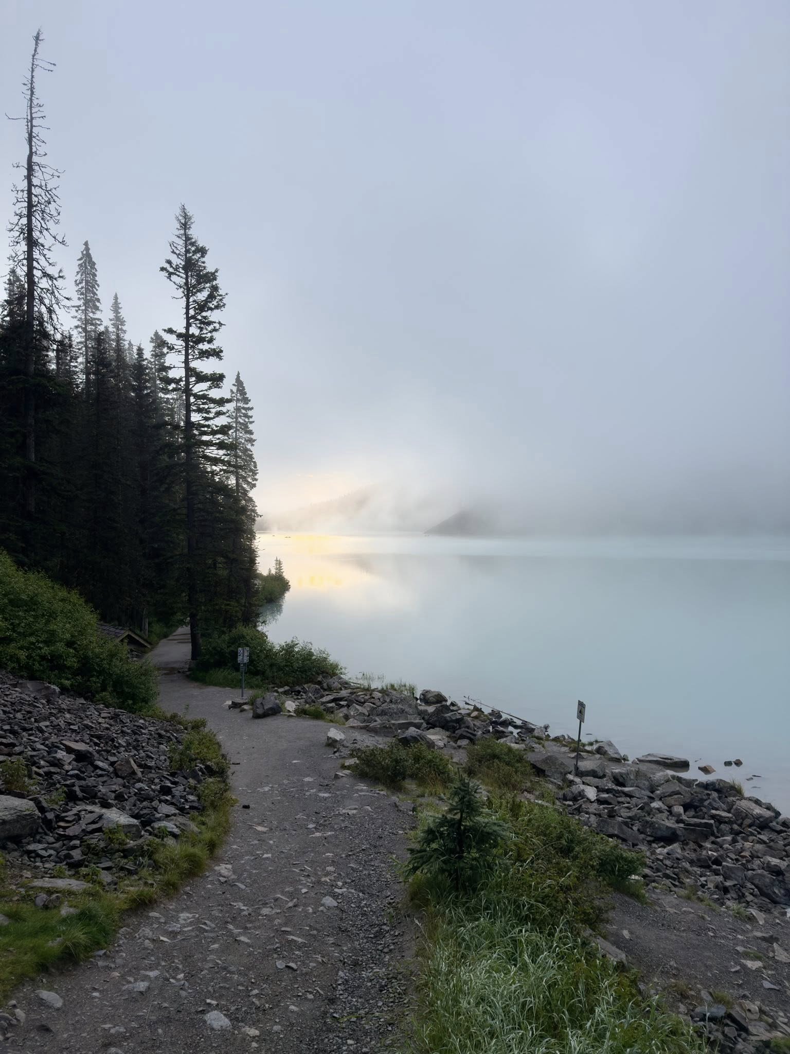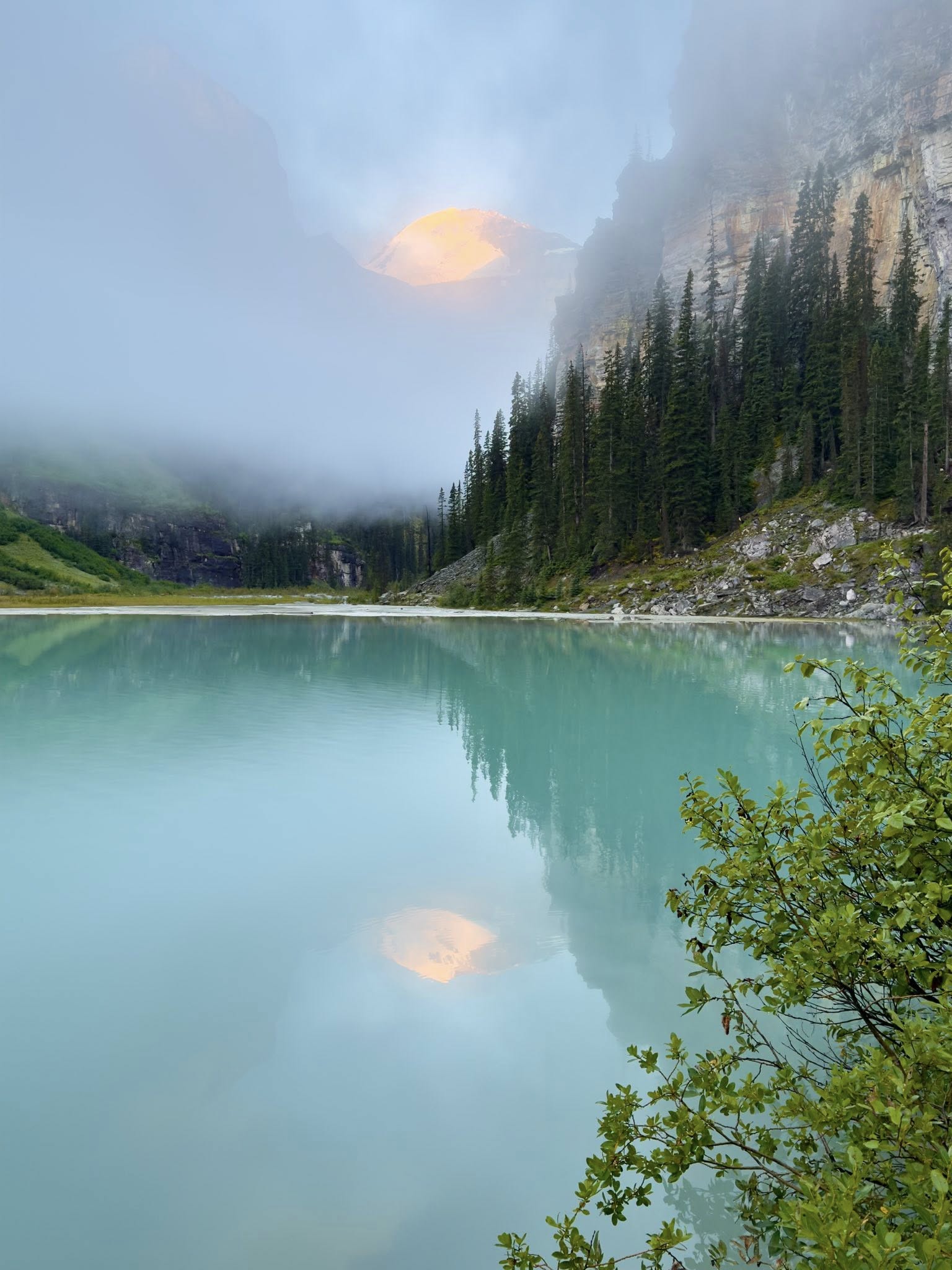 Lake Louise… 5:30 am… 2 degrees… thick fog and darkness… but after so many solitary sunrises, I couldn't say this to myself. At 5:45 am, the Lake Louise parking lot was practically full, with countless people waiting for sunrise at the edge of the lake. I instead hiked to the base of the glacier, which allowed me to avoid encountering anyone and, above all, to get better views. It's a shame about the fog, but this sunrise was also quite charming.